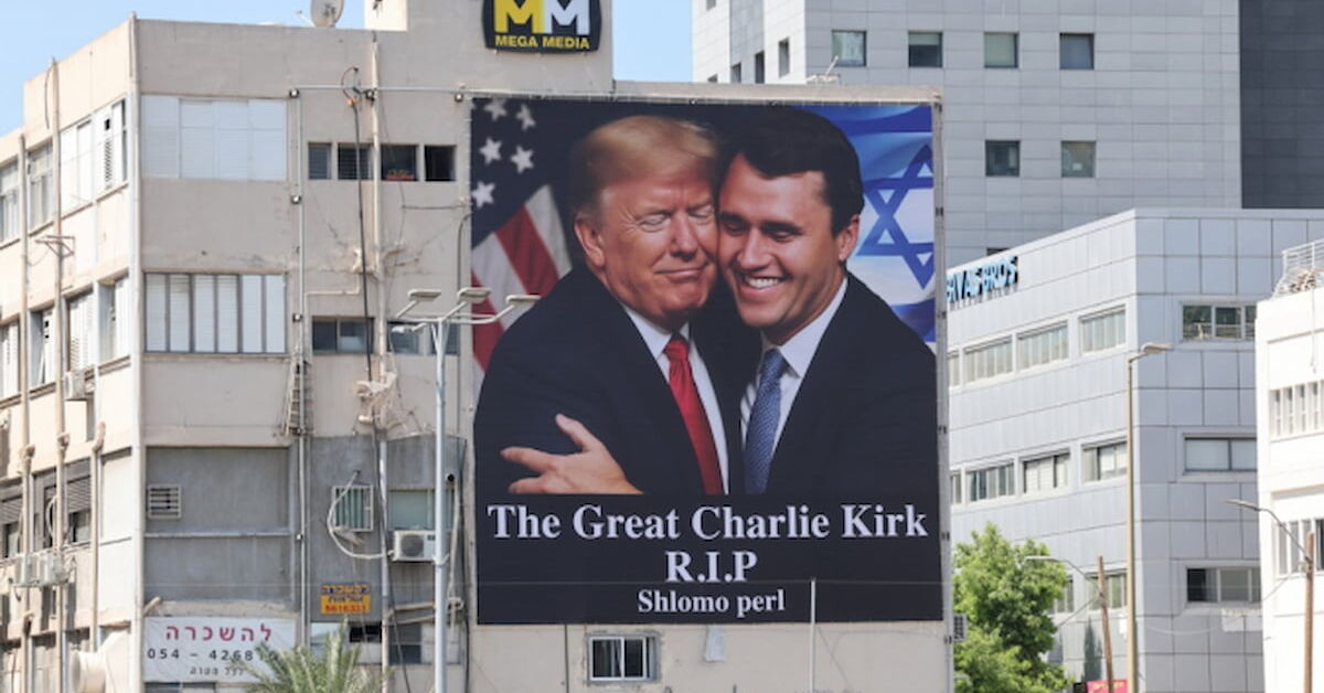 Outdoor em Tel Aviv exibe a imagem do presidente Donald Trump abraçando o ativista político conservador Charlie Kirk Créditos: Divulgação/Reprodução