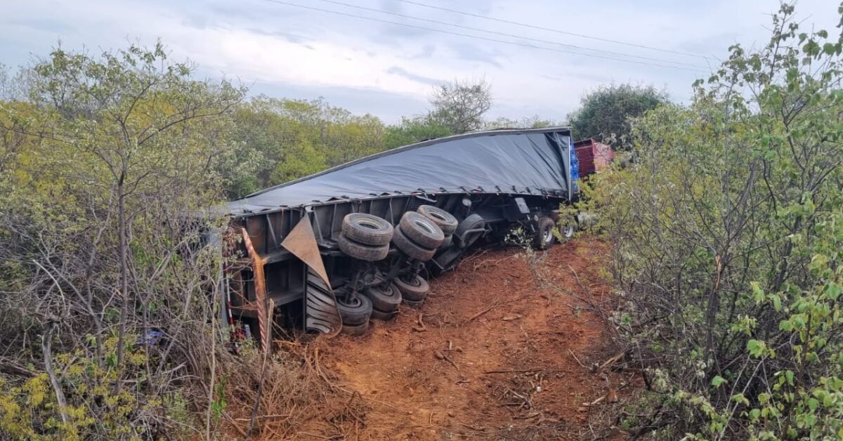 A carreta tombou no momento do acidente, e entrou no matagal. Já a caminhonete ficou totalmente destruída, no km 27,5 da BR-407.