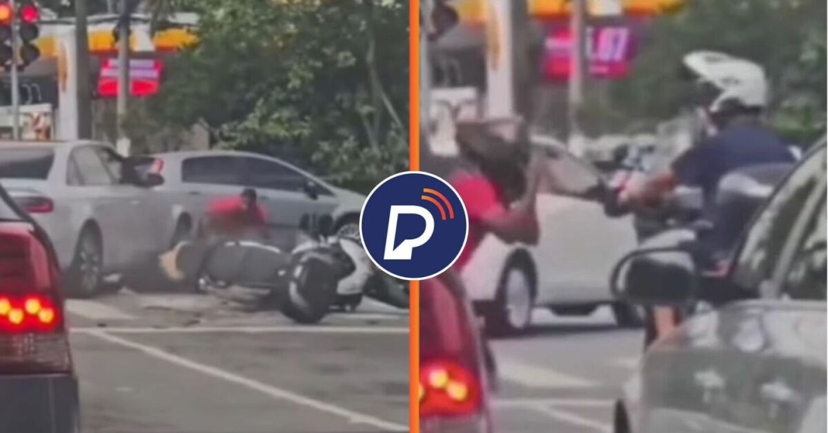 Uma testemunha filmou o momento em que os dois assaltantes, um deles armado, rendem a vítima na moto. Quando o homem entrega o veículo e o capacete, os ladrões sobem na moto para fugir, mas um carro avançou sobre eles, que caíram da moto e fugiram a pé.