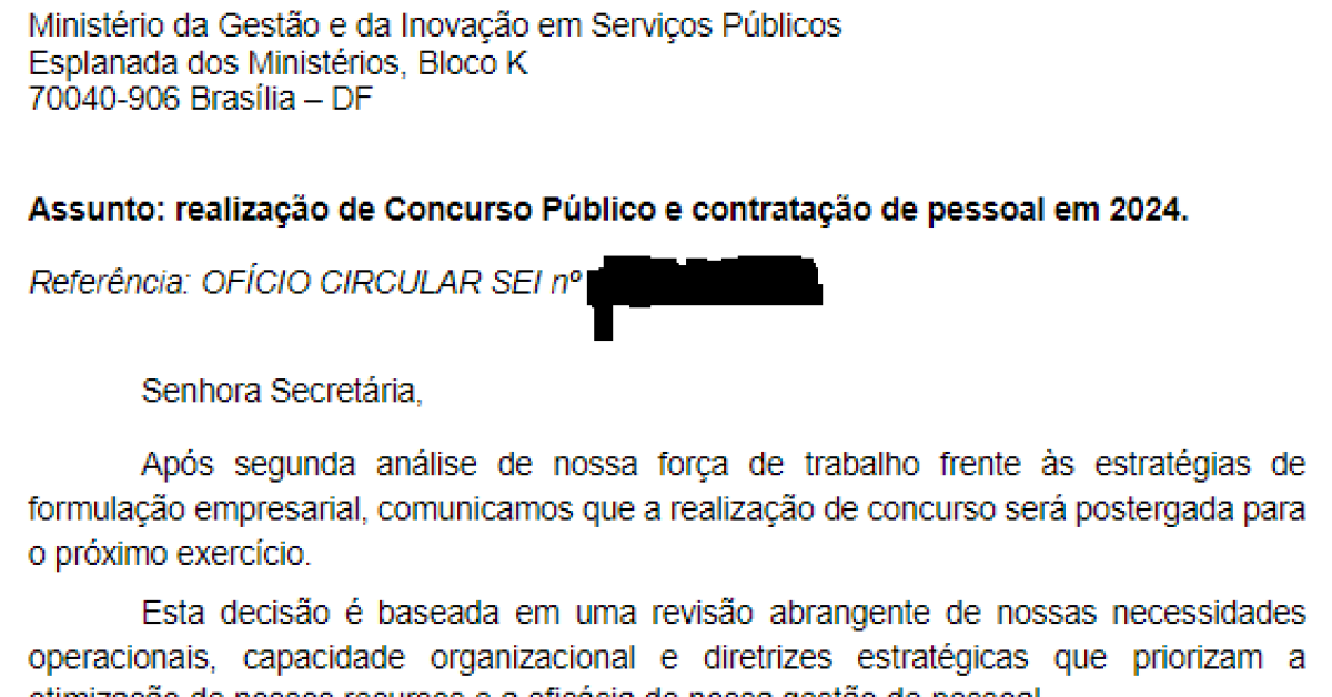 Segundo informações do Qconcursos Folha Dirigida, a companhia estava estudando a possibilidade de realizar o concurso ainda em 2024. No entanto, a empresa revelou ao MGI que a realização do novo concurso será postergada para 2025.