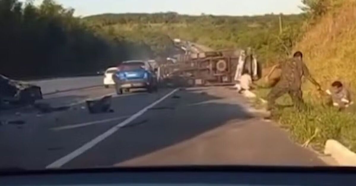 Duas carretas e um carro se envolveram em um engavetamento. Os cinco ocupantes do automóvel e o motorista de uma das carretas morreram, conforme a concessionária Arteris Litoral Sul. Imagens divulgadas pela Polícia Rodoviária Federal (PRF) mostram que o carro ficou imprensado entre as duas carretas.