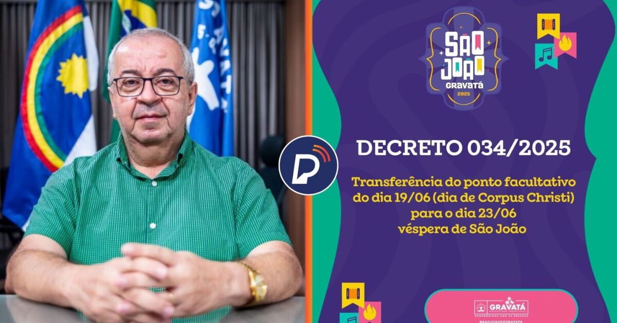 A Prefeitura de Gravatá publicou, nesta semana, o Decreto nº 034/2025, que estabelece ponto facultativo nas repartições públicas municipais da administração direta e indireta para o dia 23 de junho (segunda-feira), véspera de São João.