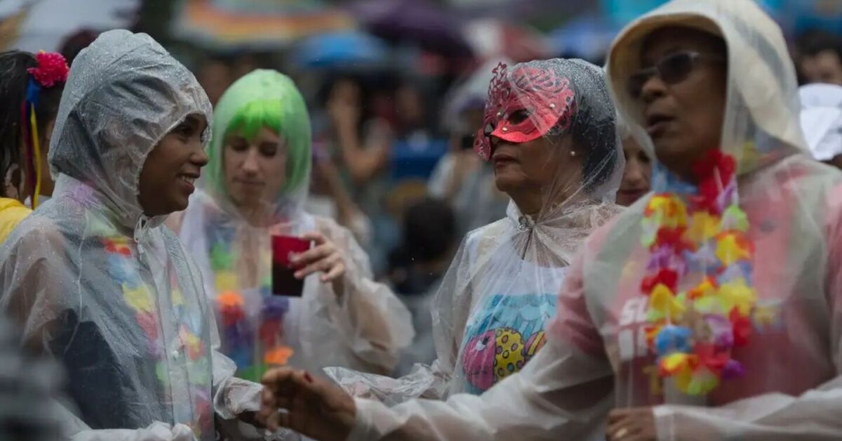 Pessoas brincando Carnaval na chuva. Foto: Marcello Casal Jr/Agência Brasil