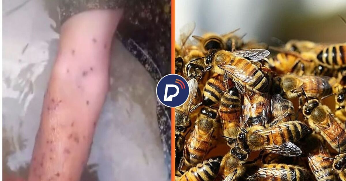 Braço da vítima todo picado e um enxame de abelhas. Foto: Arte/Portal de Prefeitura