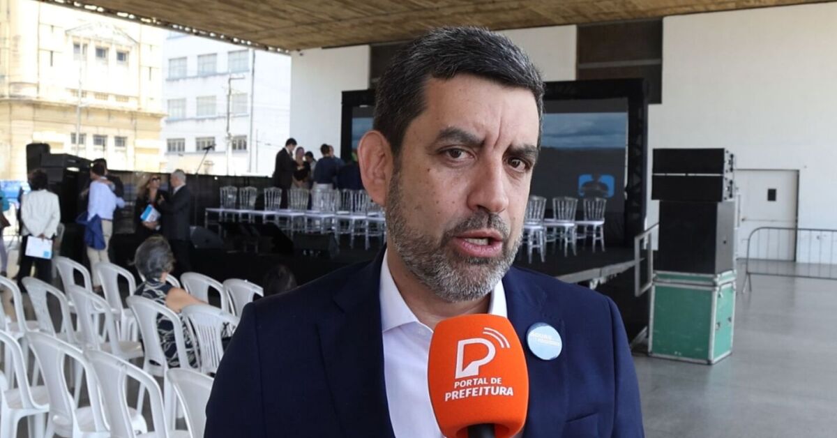Presidente da Compesa, Alex Campos, com microfone do Portal de Prefeitura. Foto: Beto Dantas/Portal de Prefeitura