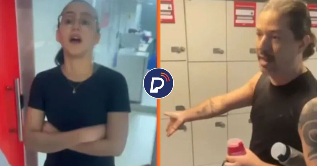 Mulher e homem impedindo personal de entrar em banheiro feminino. Fotos: Reprodução. Arte: Portal de Prefeitura