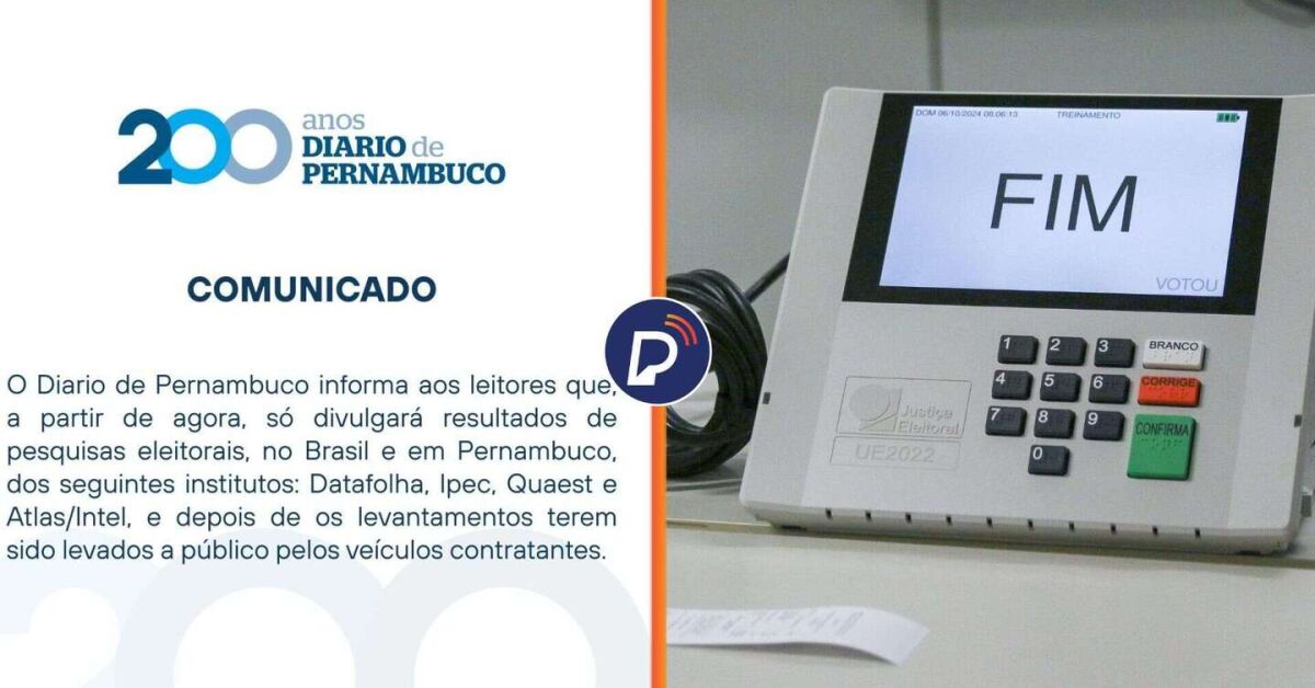 O Diário de Pernambuco anunciou na sexta-feira, 17 de abril, que a partir de agora, só irá divulgar pesquisas eleitorais de Pernambuco e Brasil dos institutos DataFolha, Ipec, Quaest e Atlas/Intel só após o contratante tornar público.