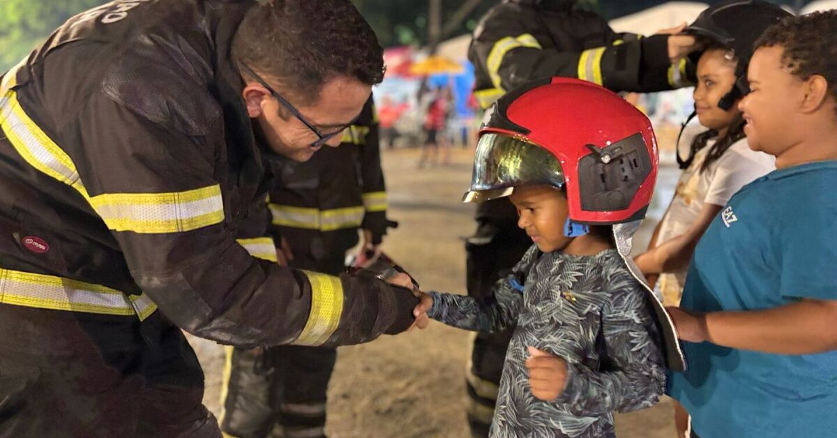 Bombeiro interagindo com crianças na Festa da Pitomba. Foto: Divulgação/SDS