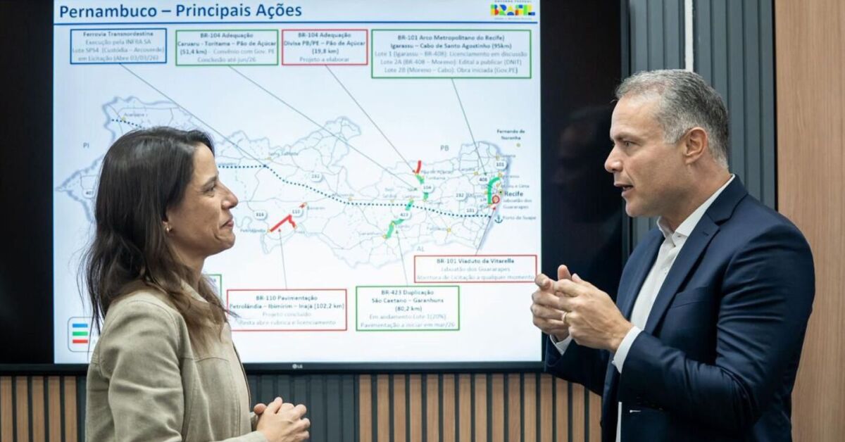 A governadora Raquel Lyra (PSD) se reuniu, na terça-feira, 3 de fevereiro, em Brasília, com o ministro dos Transportes, Renan Filho, para tratar do andamento e da ampliação de importantes obras de infraestrutura viária em Pernambuco. Na pauta, estiveram os avanços das obras do Arco Metropolitano, a travessia urbana de Toritama, na BR-104, e a duplicação da BR-423.
