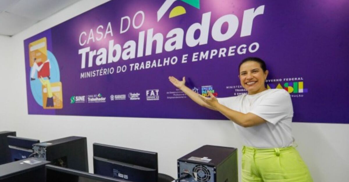 Raquel Lyra ao lado da placa da Casa do Trabalhador. Foto: Divulgação