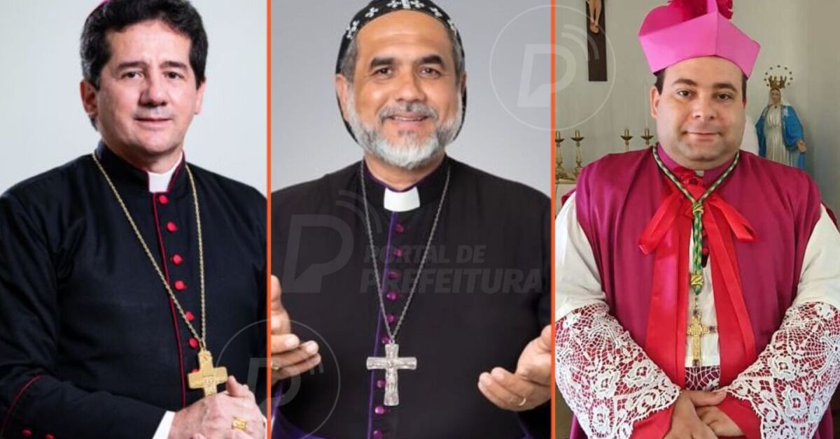 Dom Paulo Jackson, arcebispo de Olinda e Recife, Padre Kelmon e Dom Rodrigo da Silva Foto: Arte/Portal de Prefeitura