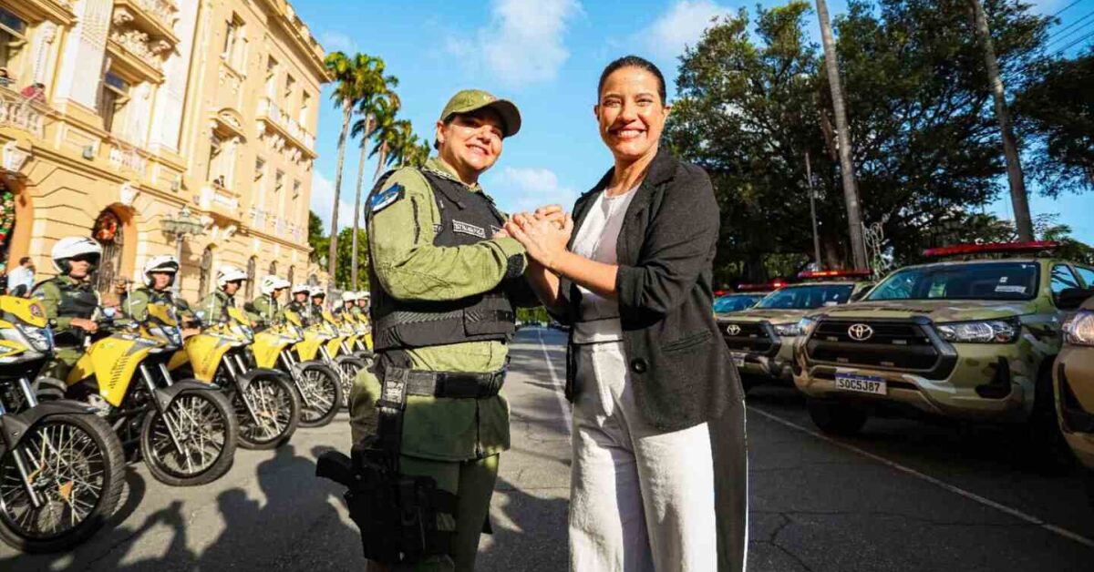 Governadora Raquel Lyra ao lado de policial militar. (Foto: Janaína Pepeu/Secom)