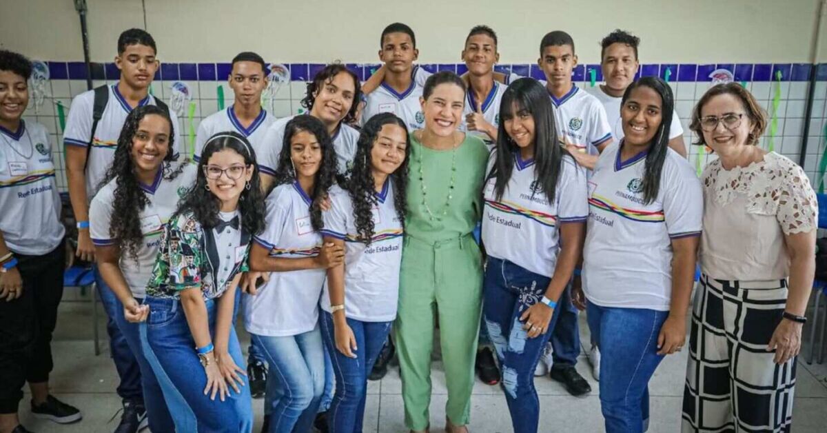 Governadora Raquel Lyra ao lado de estudantes da rede pública. Foto: Divulgação