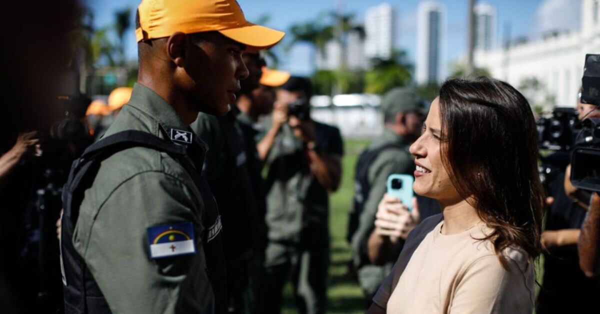 Governadora Raquel Lyra ao lado de policial militar. Foto: Hesíodo Góes/Secom