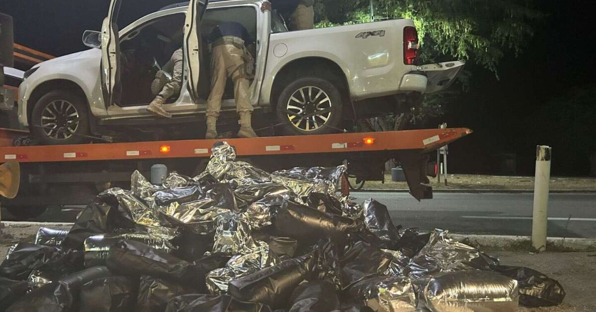 A caminhonete foi abandonada na PE 265 e os ocupantes não foram localizados. Na carroceria e na cabine do veículo foram encontrados dezenas de pacotes com a droga.