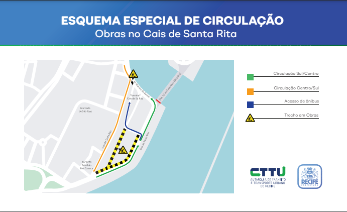 A Autarquia de Trânsito e Transporte Urbano do Recife (CTTU) informa que, devido à obra de construção de um novo Centro de Convenções, a partir do dia 1º de junho será proibido circular no Cais de Santa Rita (pista oeste) no sentido Zona Sul.