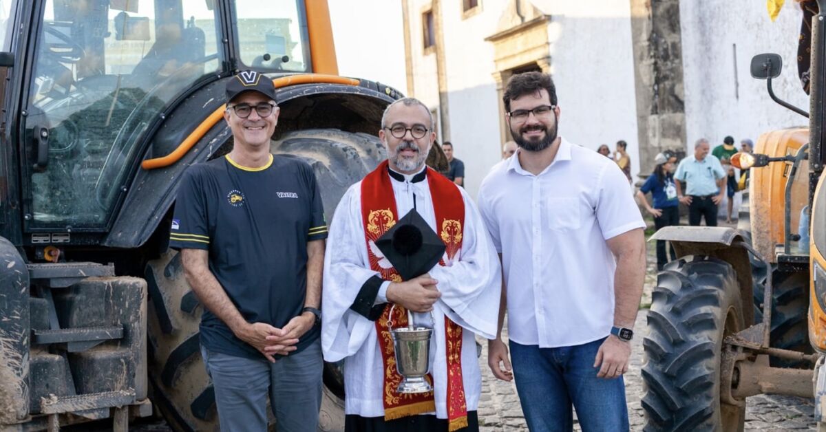 César Ramos em expedição de tratores no centro de Igarassú com Padre Josivan e Frederico Petribu (diretor-presidente da São José Agroindustrial) Foto: Wesley Laurentino
