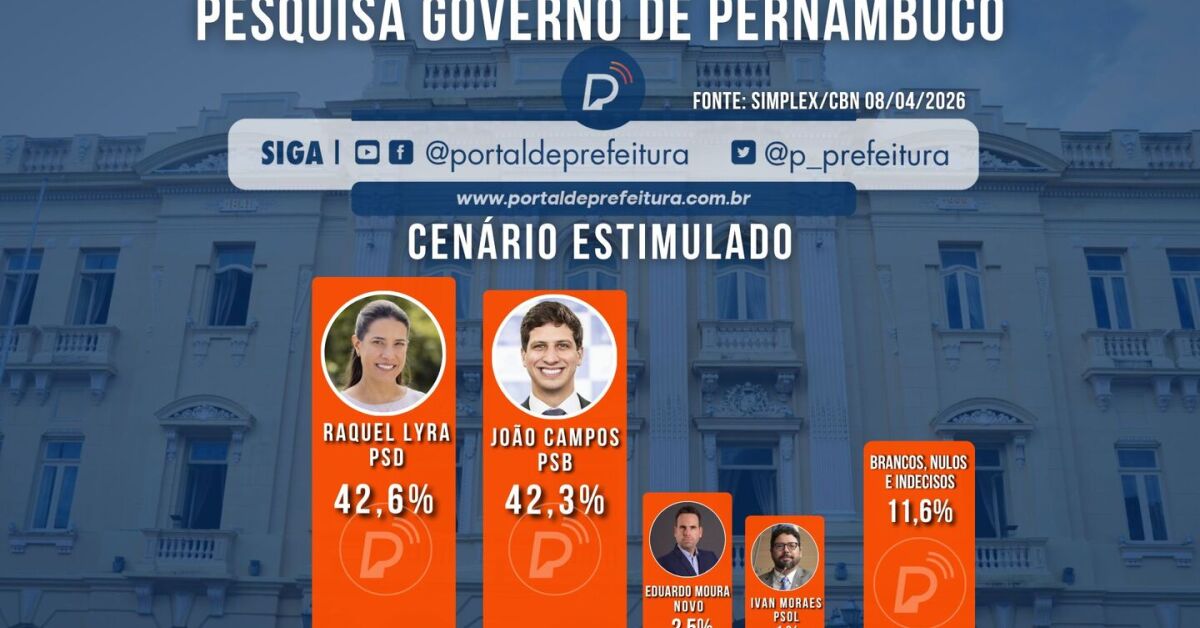 A pesquisa Simplex/CBN, divulgada nos primeiros minutos desta quarta-feira, 8 de abril, pelo Blog do Elielson, mostra a governadora Raquel Lyra (PSD), com 42,6% dos votos totais ao Governo de Pernambuco no cenário estimulado, contra 42,3% de João Campos (PSB). Na sequência, Eduardo Moura (Novo) aparece com 2,5%, enquanto que Ivan Mores (PSOL), 1%. Brancos ou Nulos foram 6,3% e 5,3% não souberam ou não responderam.