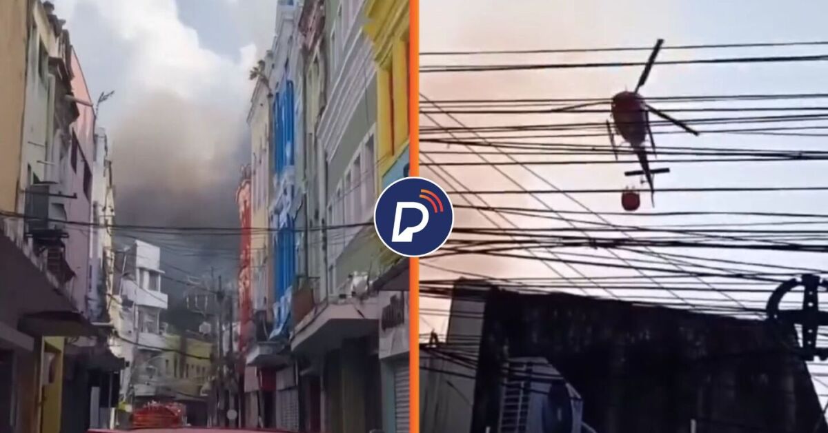 Helicóptero em ação contra chamas nas lojas incendiadas no Recife. Fotos: Reprodução. Edição: Portal de Prefeitura