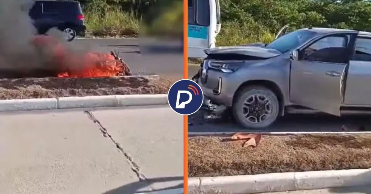 Motocicleta pegando fogo e estado da caminhonete após colisão. Fotos: Reprodução. Arte: Portal de Prefeitura