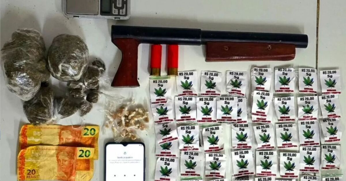 O responsável pelo ponto de venda não foi encontrado. Mas o efetivo localizou uma espingarda calibre 12 com duas munições, 59 big bigs e outras 150g de maconha, 30 pedras de crack, uma balança de precisão, um celular com queixa de roubo e R$ 40,00 em espécie.