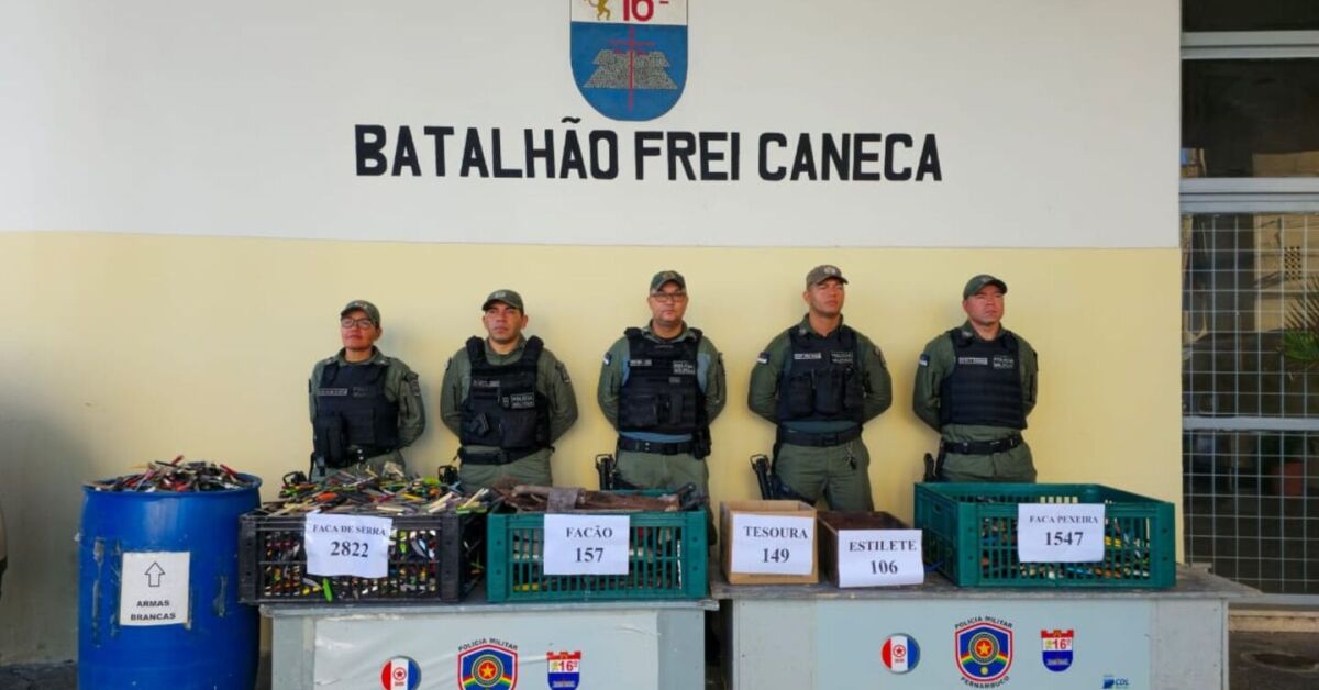 Esses objetos foram recolhidos durante ações preventivas e abordagens realizadas na área de atuação do batalhão, incluindo o centro do Recife.