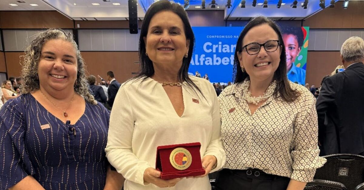 A gestora municipal esteve acompanhada da secretária municipal de Educação Andreika Assesker e da diretora de Ensino Mônica Dias. O prêmio faz parte do programa Compromisso Nacional Criança Alfabetizada (CNCA), desenvolvido pelo Ministério da Educação (MEC).
