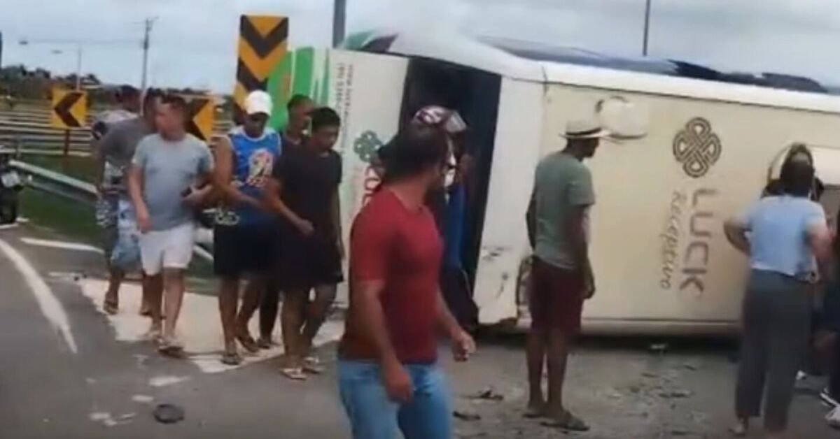 Vídeos que circulam nas redes sociais revelam o ônibus tombado no meio da pista e várias pessoas com malas e mochilas.