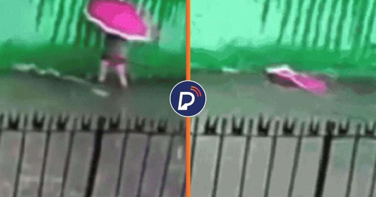 A câmera de segurança instalada em um imóvel próximo registrou o acidente. Nas imagens, é possível ver Adriana caminhando lentamente, com uma sombrinha nas mãos, quando a água a puxa. Foi uma situação muito perigosa para qualquer mulher.