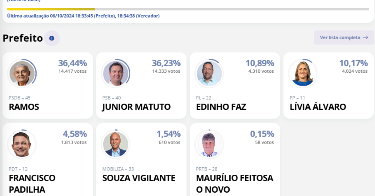 Com as votações encerradas às 17h deste domingo, 6 de outubro, e o início das apurações, no site no Tribunal Superior Eleitoral (TSE), os números relevam que com 16,82% das urnas apuradas, Ramos (PSDB) com 36,28% (12.323 votos), seguido de Junior Matuto (PSB) com 36,23% (14.333 votos).