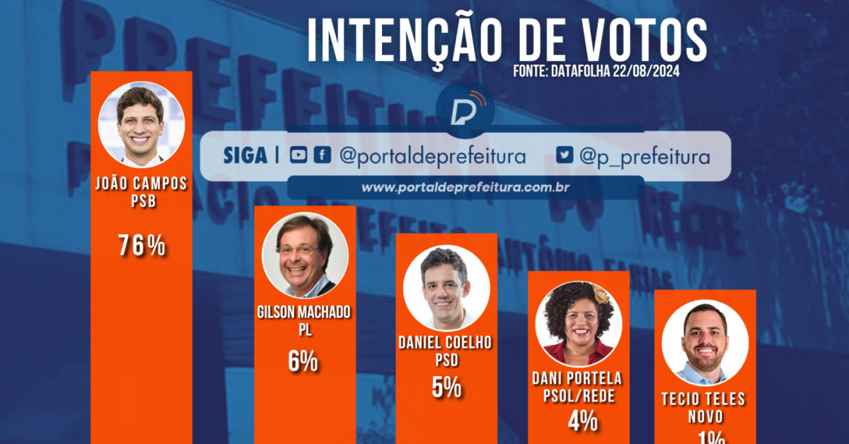 Foi divulgada na tarde desta quinta-feira, 22 de agosto, a primeira pesquisa da Datafolha após o início da campanha eleitoral, que mostra como está a disputa para a prefeitura do Recife. No cenário apresentado, o atual prefeito do Recife, João Campos (PSB), aparece com 76% das intenções de voto, seguido pelo candidato do PL, Gilson Machado, com 6%. O ranking continua com Daniel Coelho (PSDB) com 5%, apoiado pela governadora Raquel Lyra, Dani Portela (PSOL) com 4% e Técio Teles (Novo) com 1%.