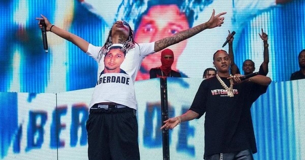 O rapper de 22 anos causou controvérsia durante sua apresentação no Lollapalooza em março deste ano, ao utilizar uma camisa estampada com a foto de seu pai, Marcinho VP, conhecido como líder do Comando Vermelho, e a palavra “liberdade”.
