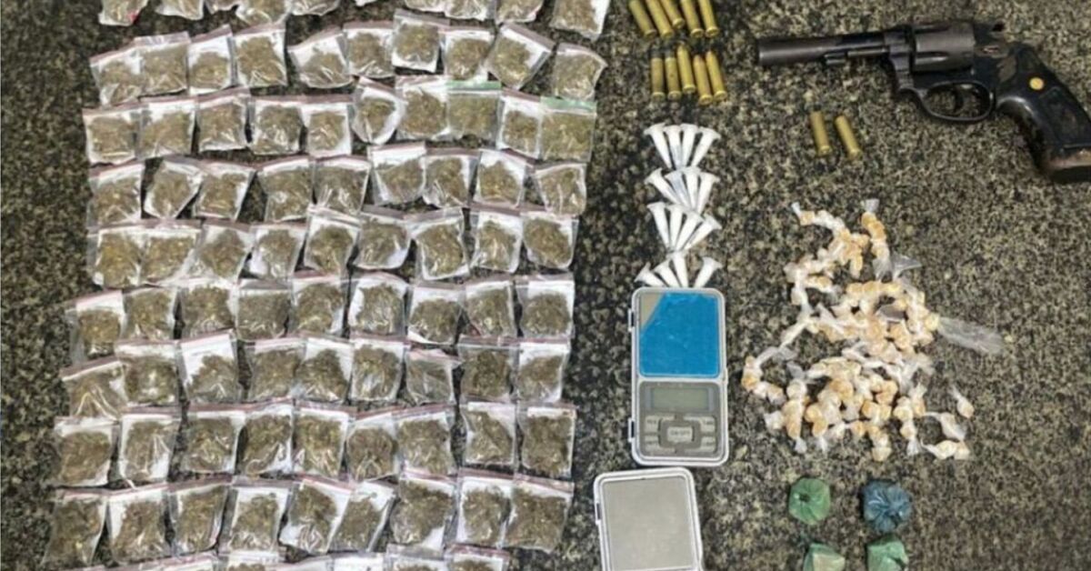Com o homem, foram encontrados um revólver calibre 38, 12 munições, 77 pacotes de maconha, 16 pinos de cocaína, 124 pedras e outras 30g de crack, além de duas balanças de precisão.