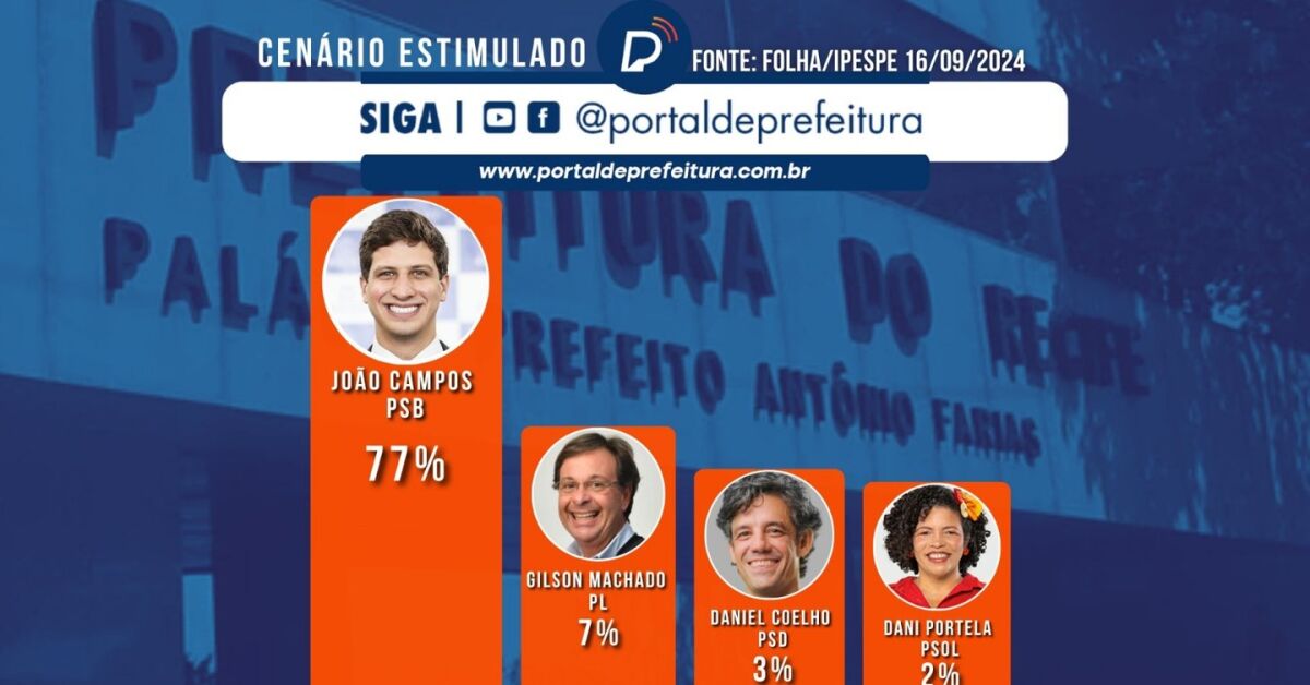 João Campos segue na frente com 77% das intenções de voto na Pesquisa Folha/IPESPE. Arte: Portal de Prefeitura.