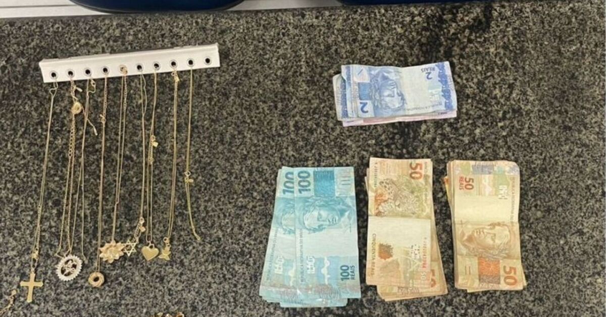 Foi dada voz de parada ao indivíduo, que resistiu à abordagem, sendo necessário o uso da força para contê-lo. Durante busca pessoal, foram encontrados R$2.939,00 em espécie no bolso do suspeito. Dentro do quarto, foi visualizado um simulacro de pistola e diversos objetos relacionados a roubos anteriores, incluindo um aparelho celular, um relógio Technos e várias bijuterias.