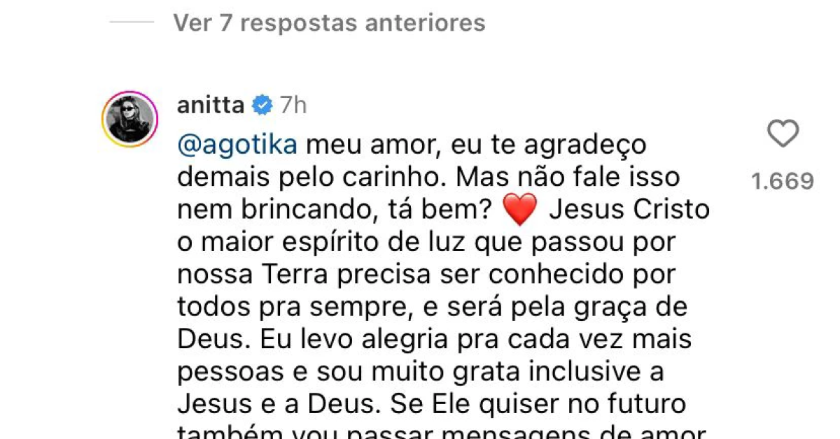 "Meu amor, eu te agradeço demais pelo carinho. Mas não fale isso nem brincando, tá bem? Jesus Cristo, o maior espírito de luz que passou por nossa Terra, precisa ser conhecido por todos pra sempre, e será pela graça de Deus. Eu levo alegria pra cada vez mais pessoas e sou muito grata inclusive a Jesus e a Deus", escreveu a cantora.