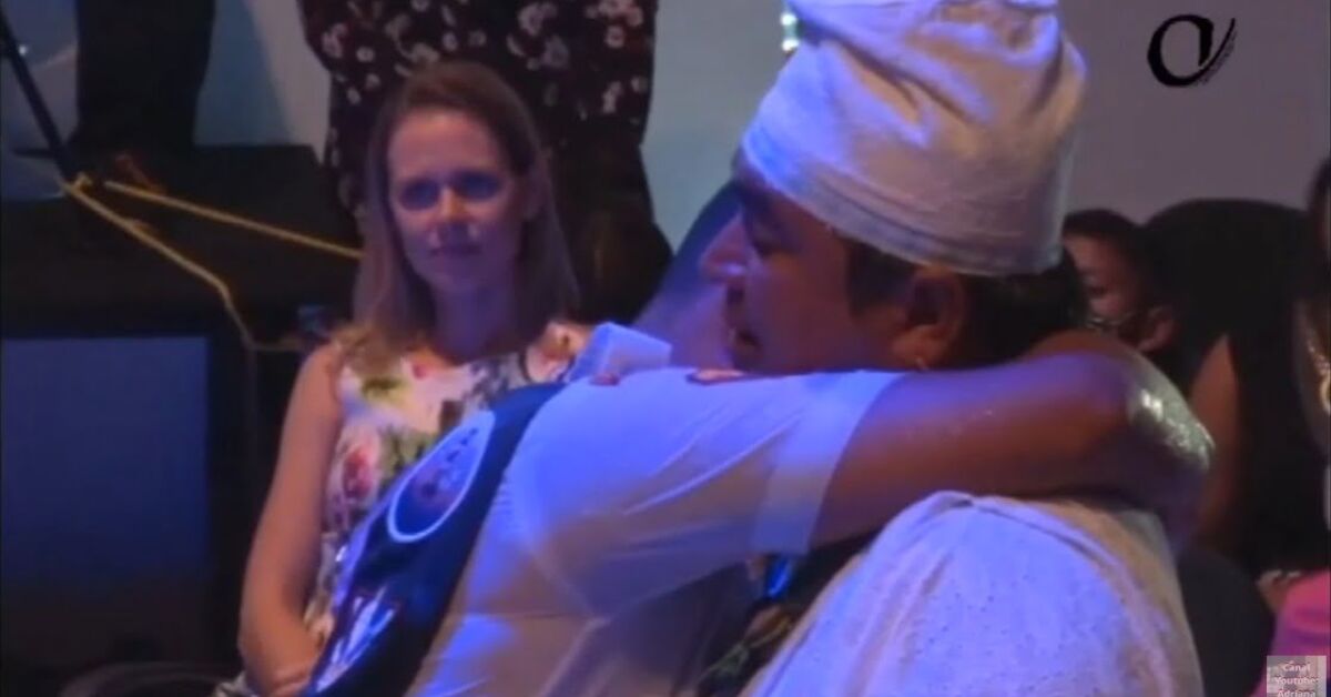Depois de descer as águas, o filho pegou o microfone e disse: “Pai, independente da religião eu te amo muito”, e o abraçou em seguida.