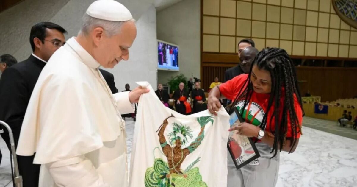 Papa Leão XIV recebe imagem de orixá em encontro com o MST no Vaticano Foto: VaticanoNews / Reprodução