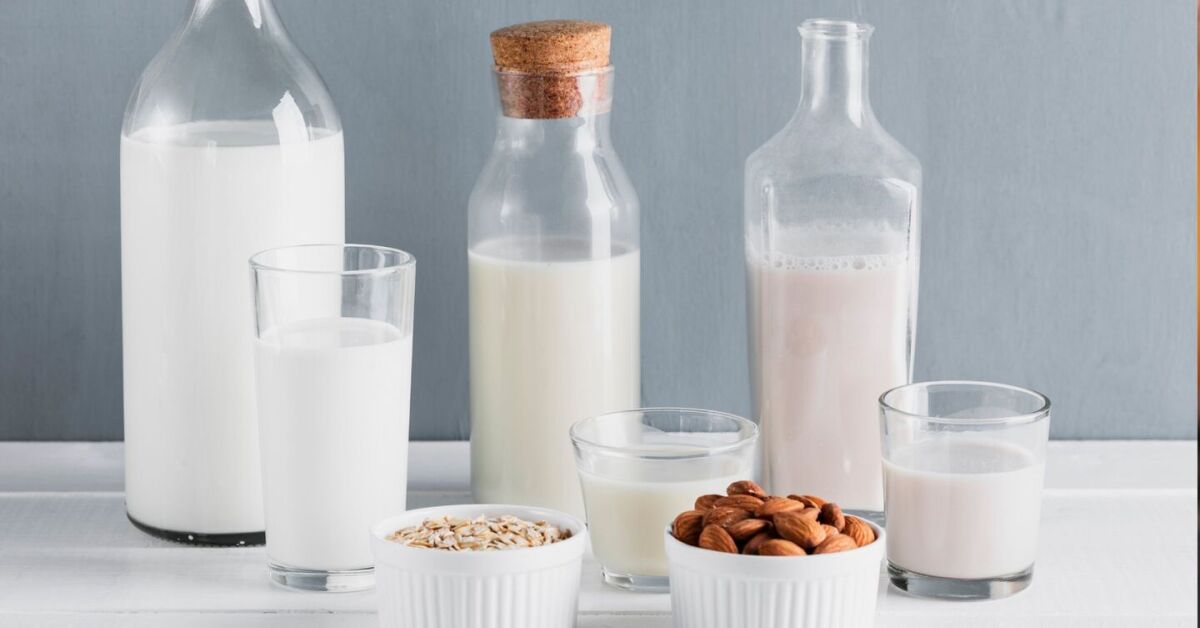 Diversos tipos de leite na mesa, mostrando variações de cor e textura. Foto: Freepik