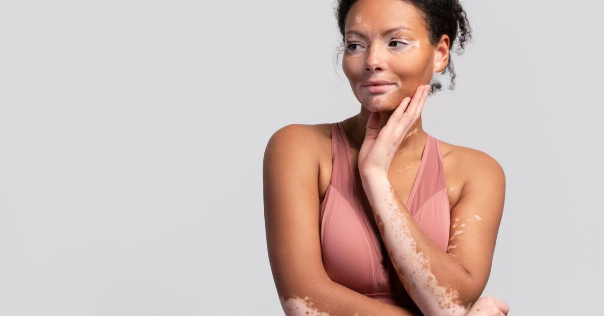 Manchas claras no braço e rosto de pessoa com vitiligo refletem a visibilidade da condição na pele. Foto: Freepik